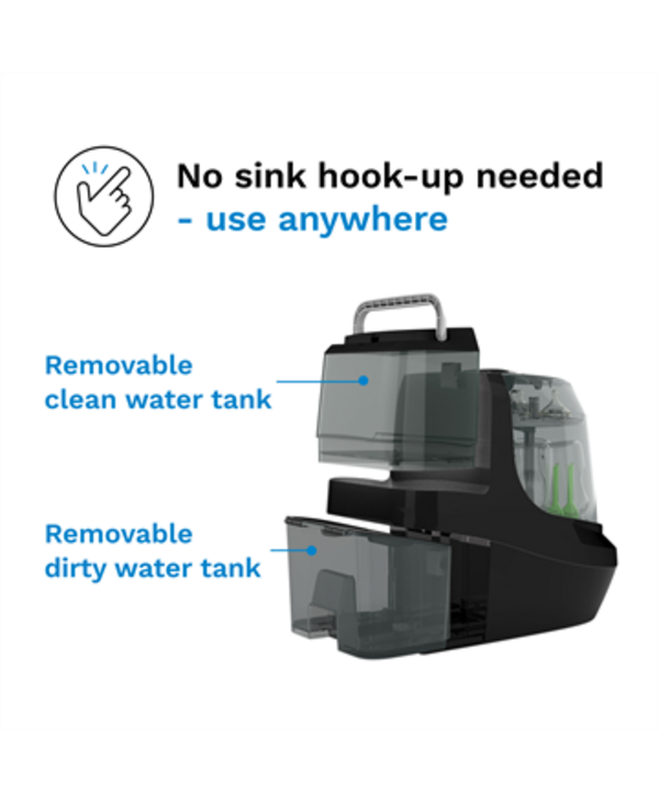 - No Sink Hook Up Required, Easy to Use: No messy drain hoses. Includes removable clean and dirty water tanks so you can use anywhere in your kitchen or around the house; Built-in wheels for easy turning; LCD Control Panel.