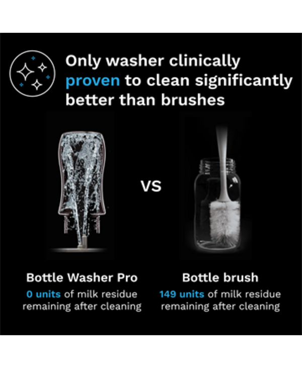 Automatically washes, sterilizes, and dries bottles, baby product parts, sippy cups and accessories—no scrubbing or dishwashers necessary. Only Washer clinically proven to clean better than a bottle brush.