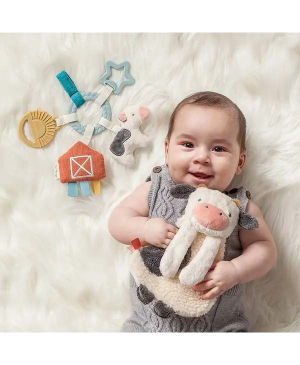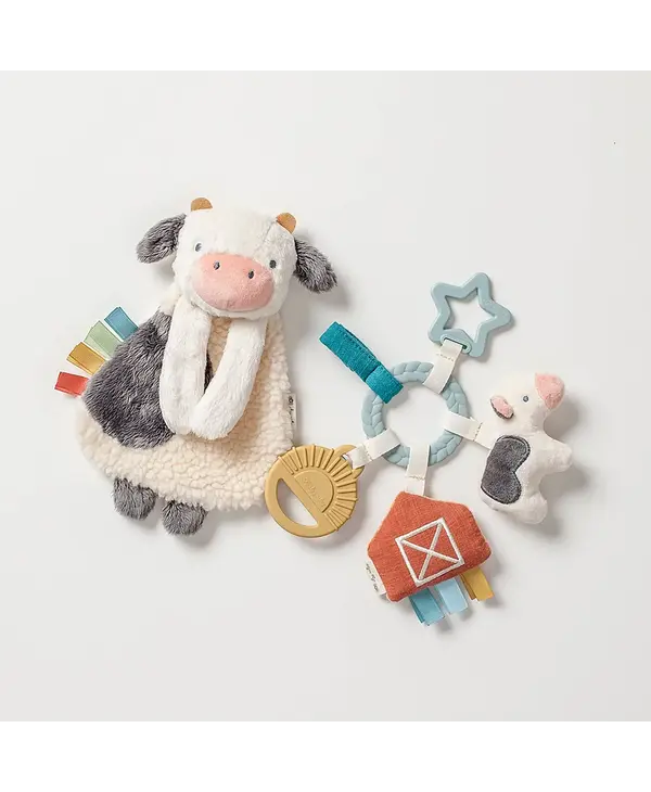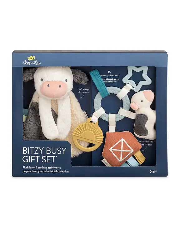 Teethe, Play & Explore! Love is in the details with our Bitzy Busy Gift Set! Featuring our Itzy Lovey and Bitzy Busy Ring, this gift set is a sensory sensation. Snuggle in close with the soft Itzy Lovey. Easily attach the Bitzy Busy Ring to a car seat or stroller for adventures ahead! The textured teethers and dangling toys that jingle & crinkle are sure to delight!