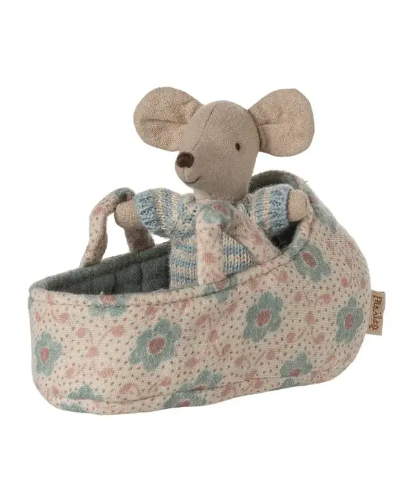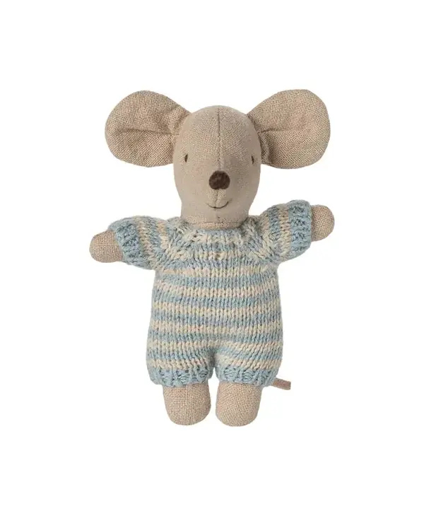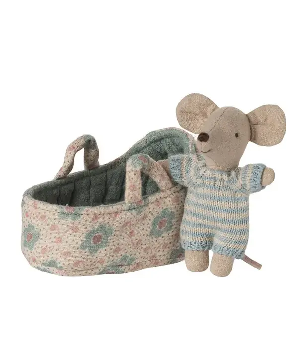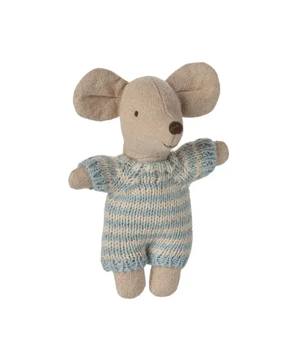A small baby mouse in a soft and striped knitted suit. It sleeps for hours in its little quilted carry cot.