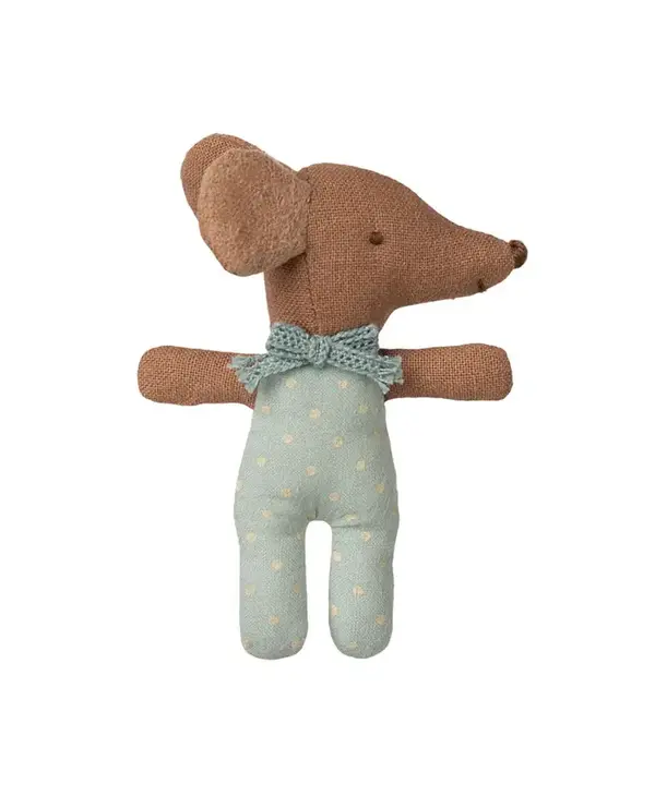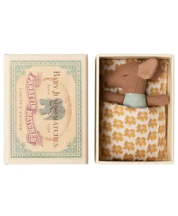 A new edition of a classic Maileg item. This mouse is ready for hours of play and sleeps tight in the little matchbox. The clothes and bedlinen are made of soft fabrics with unique prints in beautiful colours.