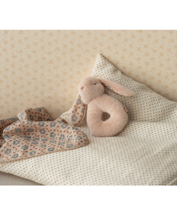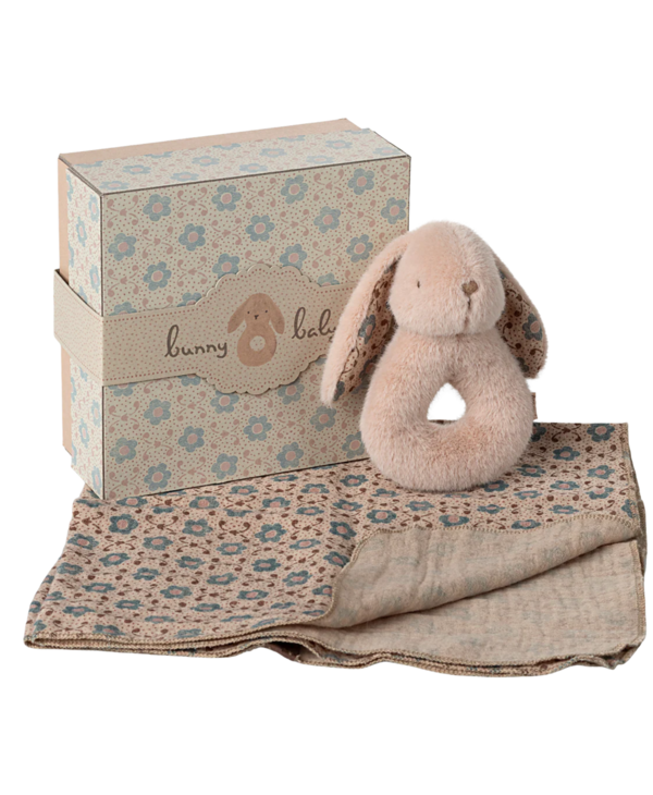 A perfect gift idea for the little ones. The set includes a soft cotton cloth and a small bunny rattle. The bunny has a small rattle inside that makes a soft sound. It all comes in a beautiful gift box.