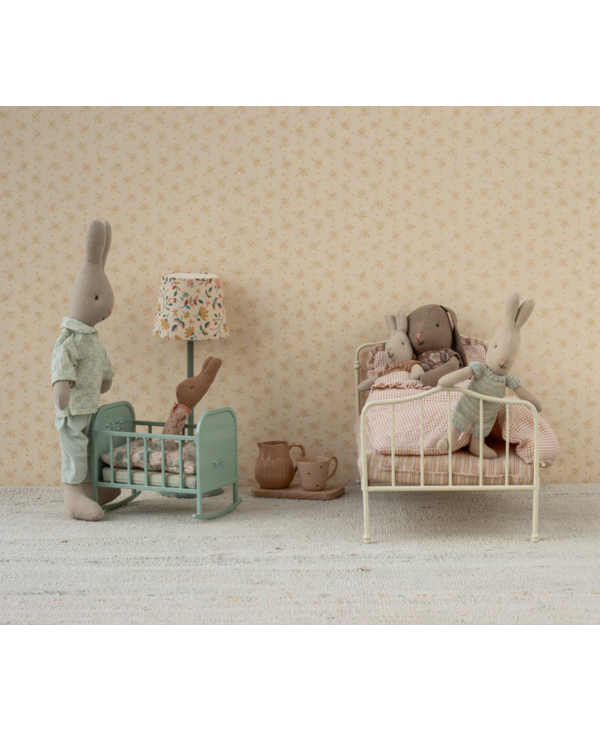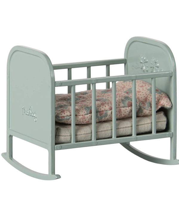 A beautifully designed cradle in metal with a soft sleeping bag and mattress inside. The cradle has a small flower embossment on the headboard and rounded legs so you can rock the little ones to sleep.