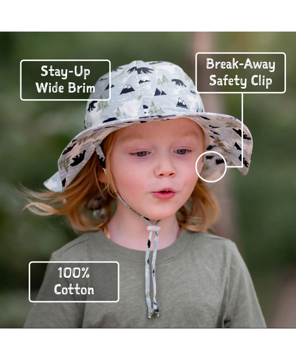 The UV protection on the hats comes from the weave of the fabric and construction of the hat. Rated UPF 50+ and safe for kids with no harmful chemicals, dyes, solutions, PFAS or fluorocarbons. Made with 100% cotton for breathable comfort on hot, sunny days. With tons of adorable prints and colours to choose from, your little explorer will love picking their favourite!