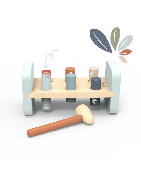 • Tap the six coloured wooden pegs down through the holes with the sturdy hammer to create a flat workbench.