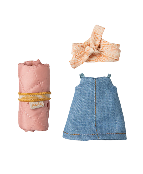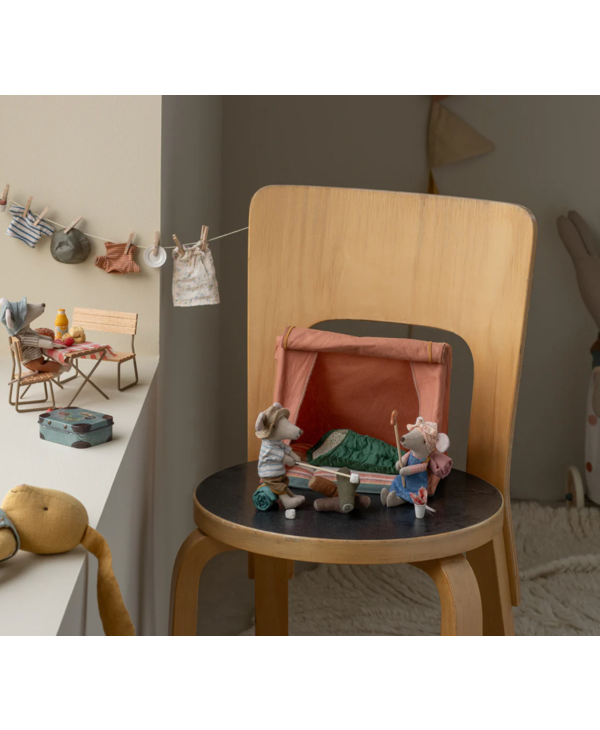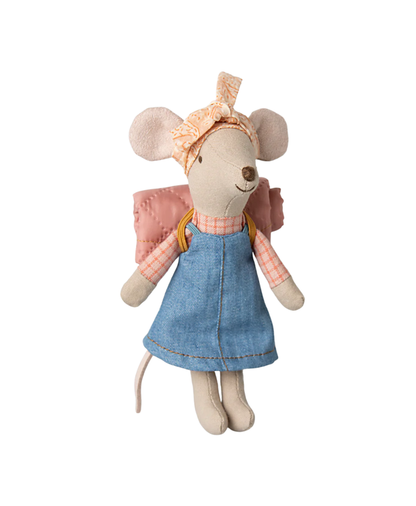 This mouse is well-prepared for a hiking trip in the wild nature. She is dressed for days of walking and brings her sleeping bag for nights under the stars. She has magnets in her hands. Add more accessories from the hiker collection for more play.