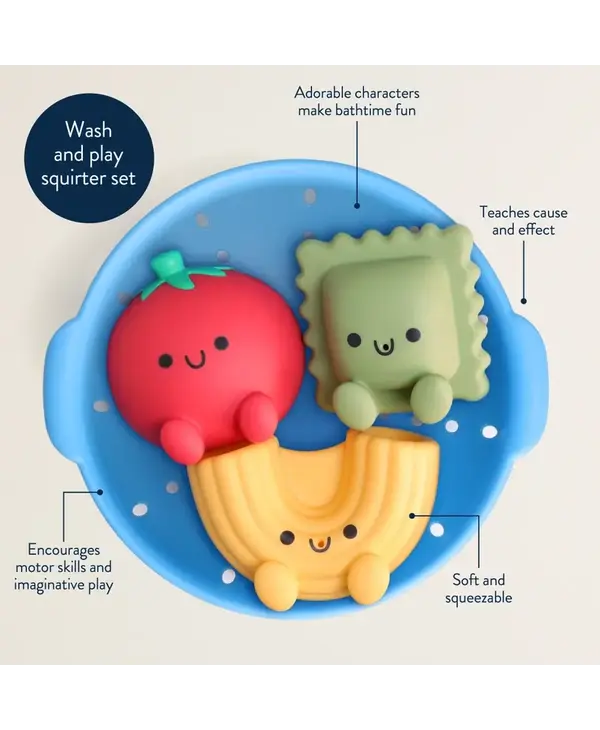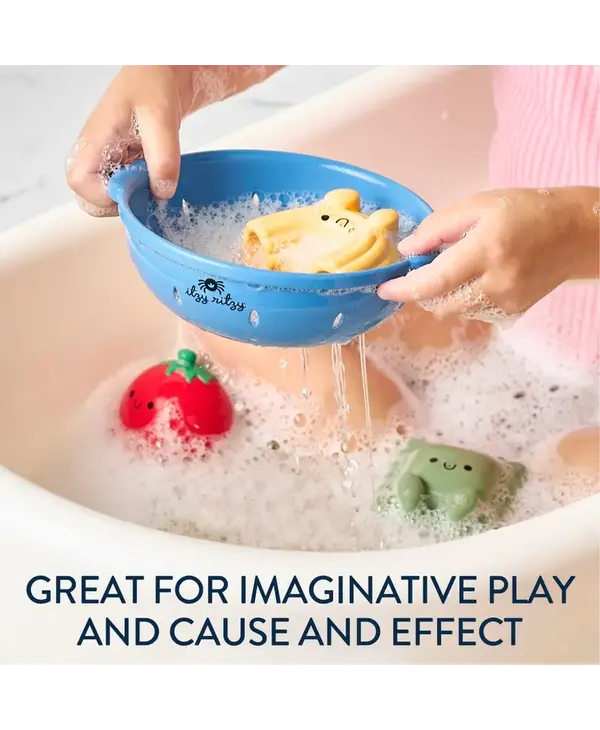 Squeeze in some fun! With Itzy Splash Pals™ bathtime play is overflowing with possibilities! These squeezable fruit-shaped squirties and sprinkle strainer encourage motor skill development and are great for creating endless bath time adventures!