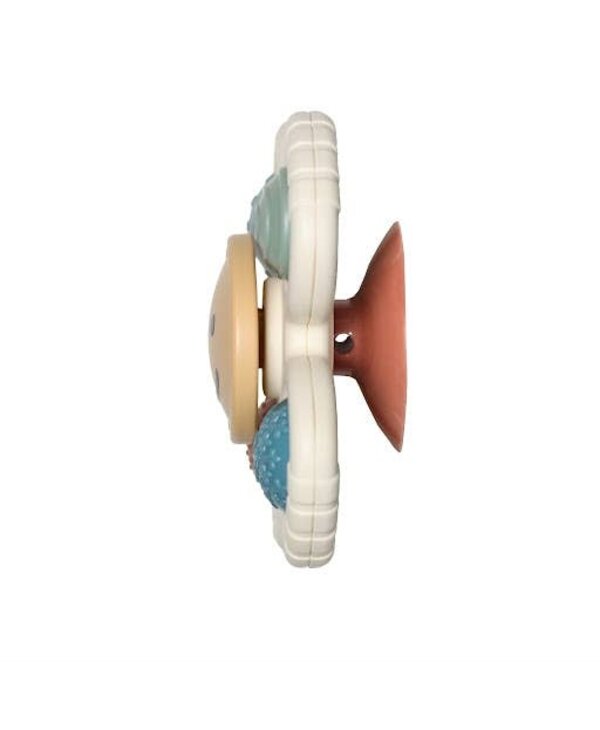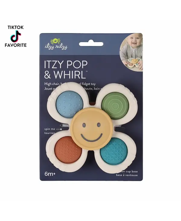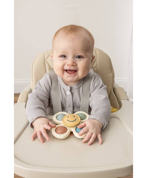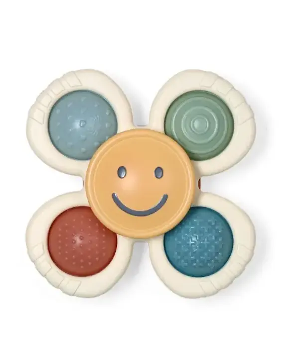 Fidget spinner with suction cup base and four silicone sensory poppers. Highchair toy format designed to entertain baby. Suction cup adheres to smooth surfaces, making for a colorful and engaging sensory toy. Helps build hand-eye coordination.