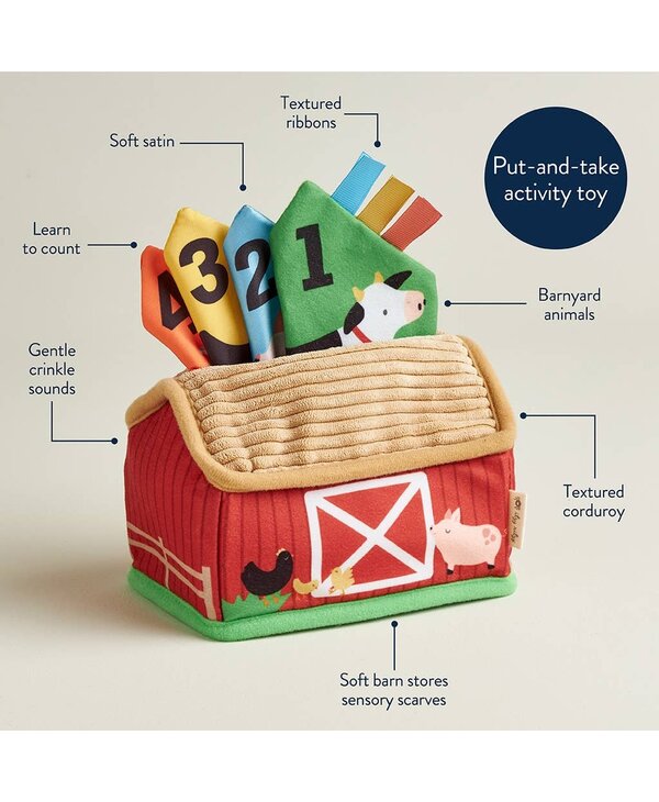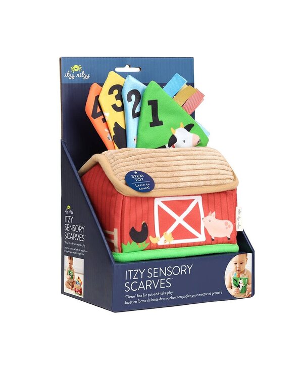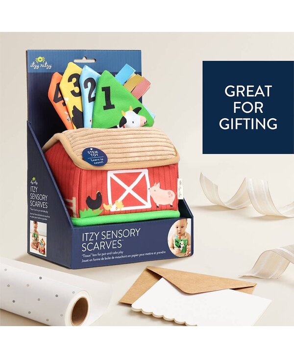 Babies love to pull scarves from a “tissue” box. Our farm themed Itzy Sensory Scarves will entertain and teach. Develop hand-eye coordination and fine motor skills with our adorable Itzy Sensory Scarves.