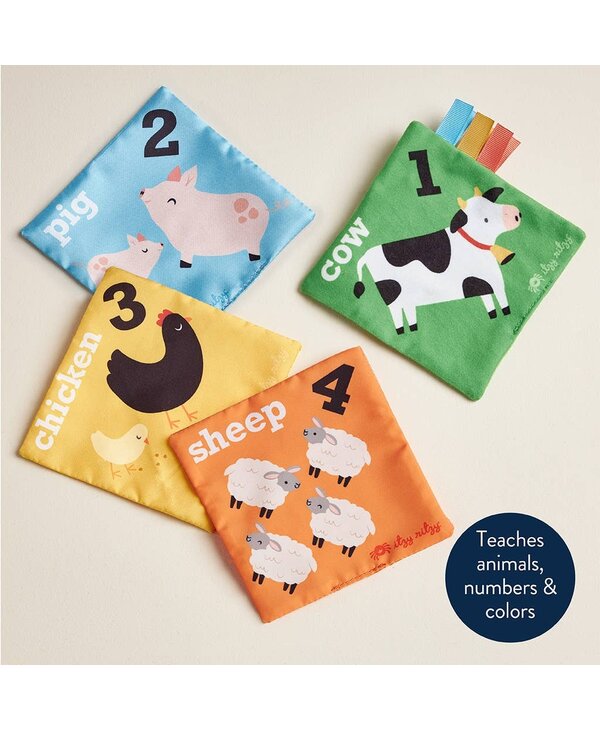 Includes 4 soft scarves with learning features including animals, numbers, colors, and textures.