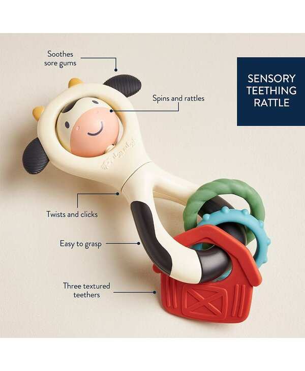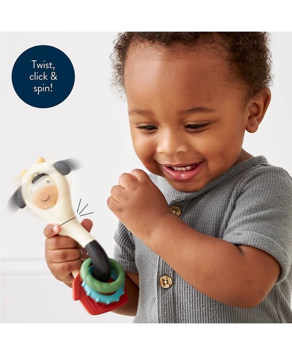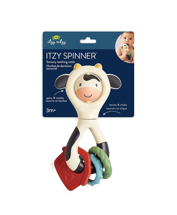 A sensory sensation for your little one! The Itzy Spinner is a sensory toy and teether all-in-one. Gentle rattle sounds and a spinning face are sure to captivate. The easy-grip handle turns and clicks keeping tiny hands busy. Soft ears and three clinking rings are textured to provide relief to sore gums. An all-purpose companion for your little adventurer!