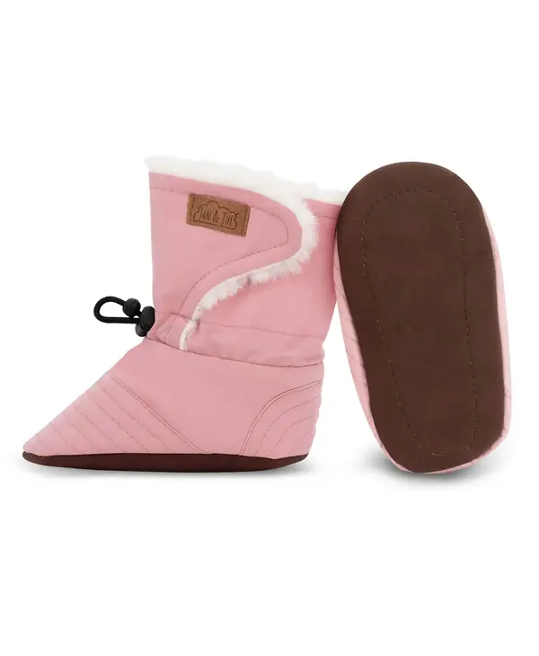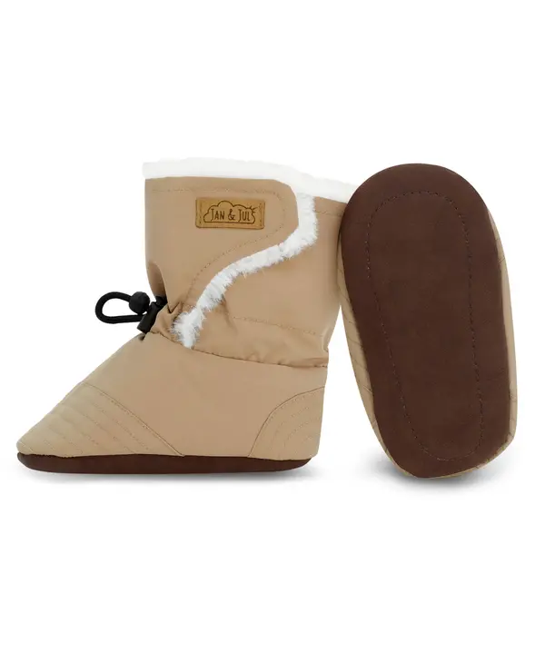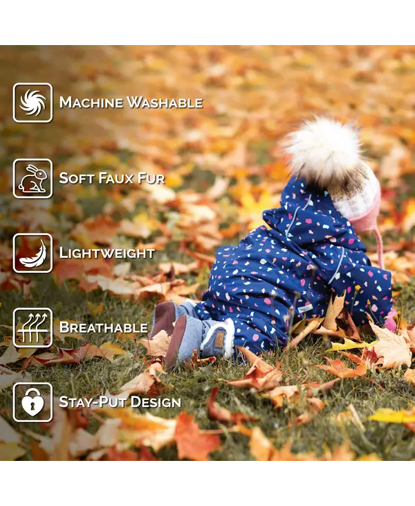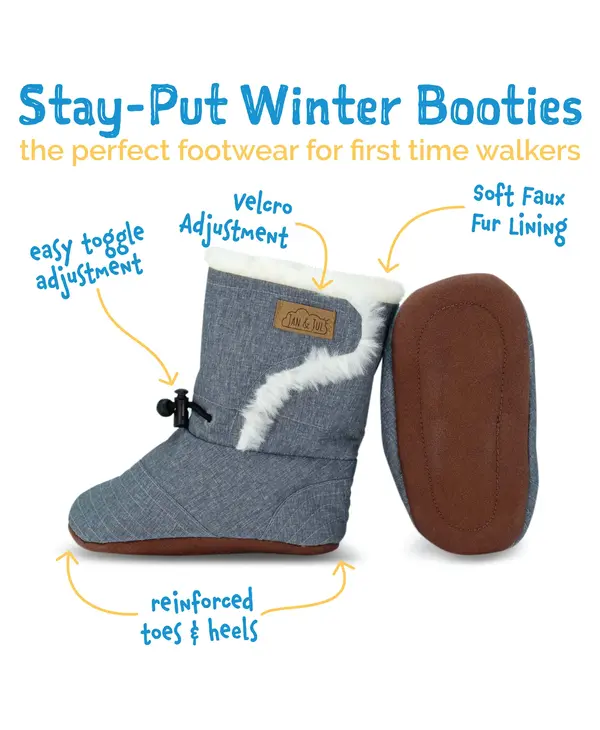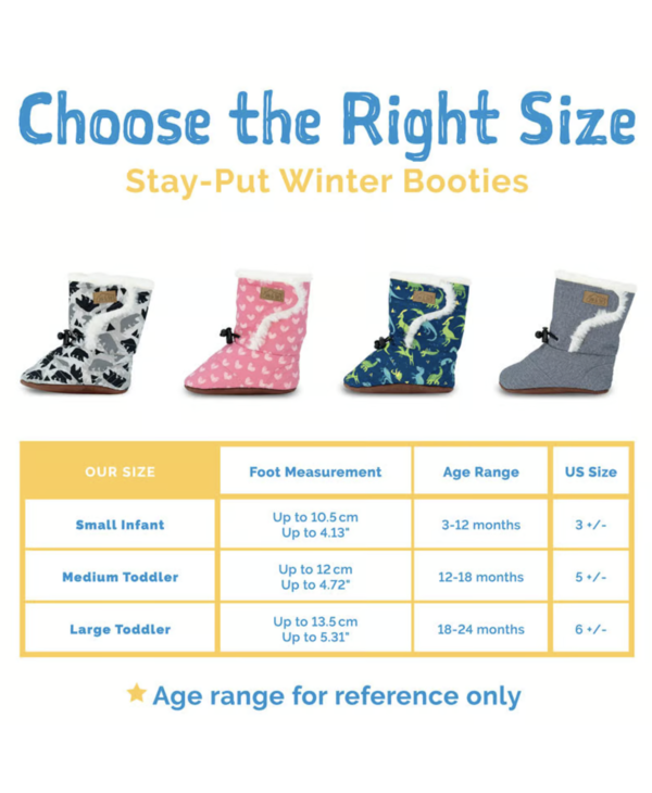 Our Stay-Put Winter Booties are designed with developing little feet in mind. Lightweight with a wide, flexible sole to naturally support growing muscles and bones. Made with a water repellent and windproof shell with faux fur lining to keep little toes toasty warm. These baby booties are available in three sizes, making it easy to find the perfect stay-put fit from the littlest babies to first-time walkers.