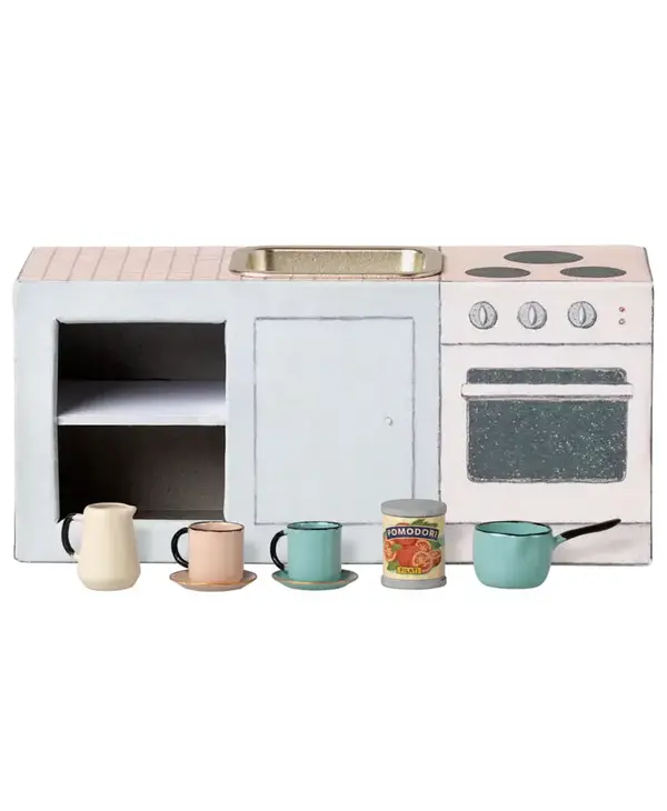 The small kitchen counter comes with 2 cups and 2 plates, a pot and a pitcher and a small can. The small sink is made of metal to look as real as possible. It fits perfectly into the kitchen in the SuitCasa Mouse House.