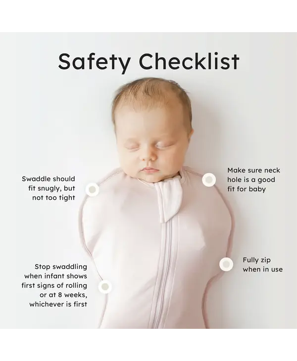 Safety fit check: The swaddle should fit snugly but not too tight. Do not use if head can pass through neck hole or if neck hole is too tight. A swaddle that is too small can restrict breathing, while one that’s too lose may pose a suffocation hazard.