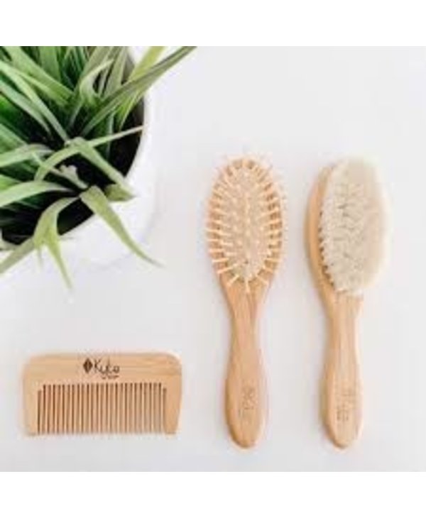 Kyte Baby Bamboo Hair Brush & Comb set is the best for your baby and for the environment. The 3-piece set contains a hairbrush with natural goat hair bristles, a hairbrush with wooden bristles, and a bamboo baby comb.