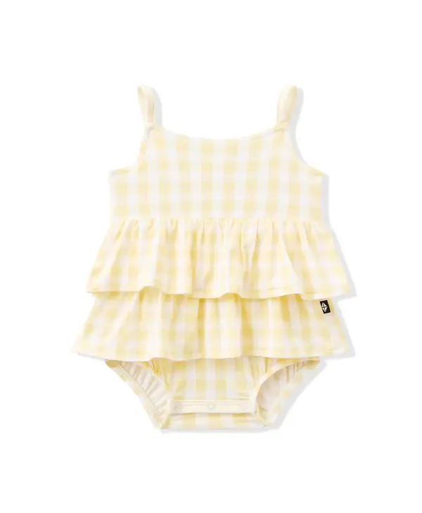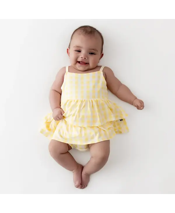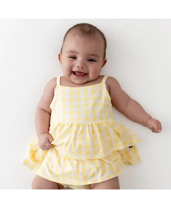 This ultra-sweet outfit is a warm-weather favorite that’s made for sunshine and fresh air. Snaps at the inseam keep diapers covered and in place, while a tiered ruffle skirt adds an adorable touch. Made from soft, breathable bamboo fabric, this romper is a go-to look that’s always cute and comfortable.
