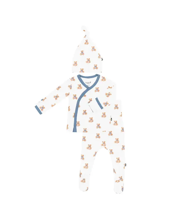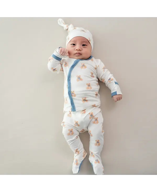 Welcome your newborn with the perfect outfit to mark the occasion. This ultra-soft set features a kimono style top that’s gentle and non-irritating on your baby’s umbilical cord stump, footed pants to cover those tiny toes, and a stretchy cap/bow.