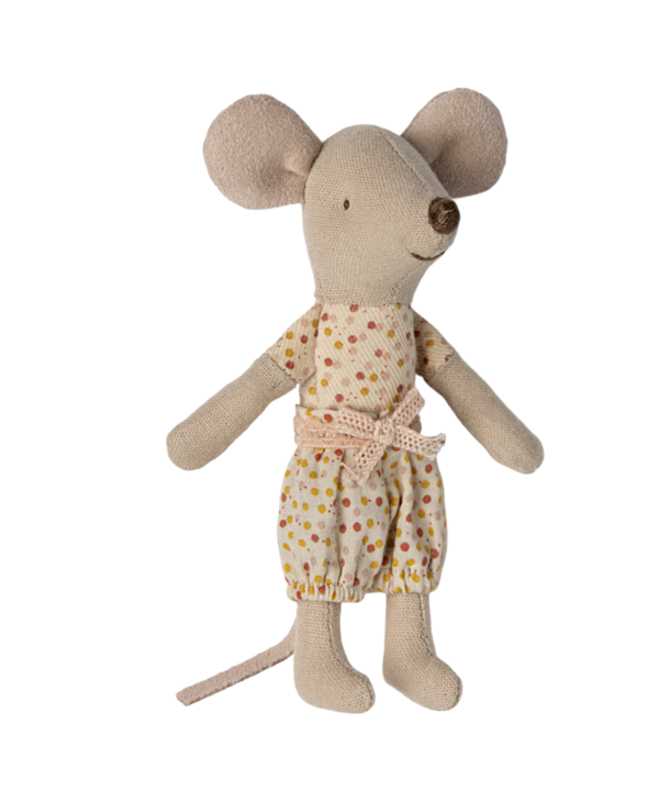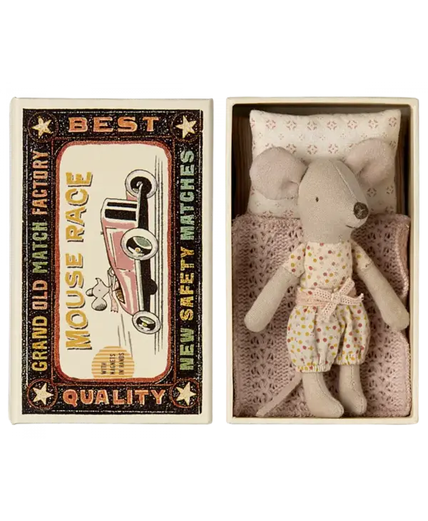 A classic Maileg item. This mouse is ready for hours of play and sleeps tight in the little matchbox. The clothes and bedlinen are made of soft fabrics with unique prints in beautiful colors. Extend the story by adding accessories to the play