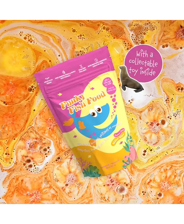 Funky Fish Food is a skin-friendly foaming bath salt that will turn the bathtub into the most colourful ocean in the world! As the droplets rise to the top, delight in the beautiful patterns they create!