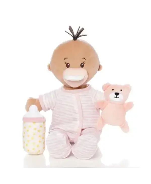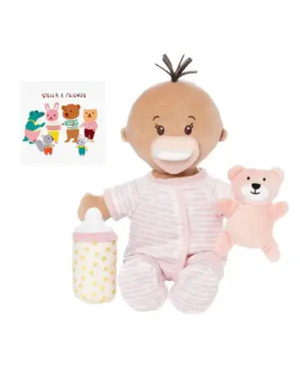 The Love, Stella Sleepy Time dolls are the perfect size for holding, hugging, and nurturing role play to foster social and emotional development. Dolls are 100% soft with a soothing light lavender scent. The doll's bottom is lightly weighted and designed to sit unassisted - perfect for playtime! Sleepy Time doll has embroidered features, fabric hair, a plump tummy, and a cute little belly button. The set includes a signature magnetic pacifier, a magnetic bottle, a teddy bear companion, and a mini paper bedtime picture book. Clothes are removable and feature hook-and-loop closures for supporting elementary dressing skills.