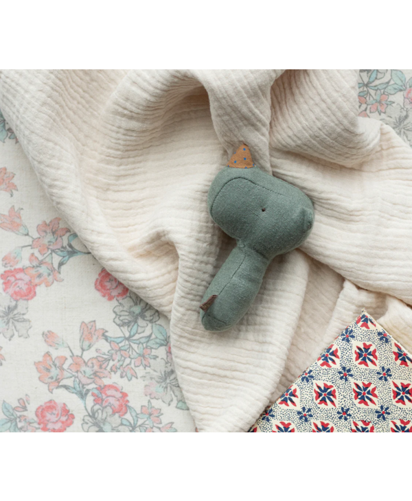 Lullaby friends is a collection of beautiful items for babies. This rattle is perfectly shaped for a small hand and has a stimulating rattle sound. It is made in soft fabrics with unique prints and packed in a beautiful gift box.