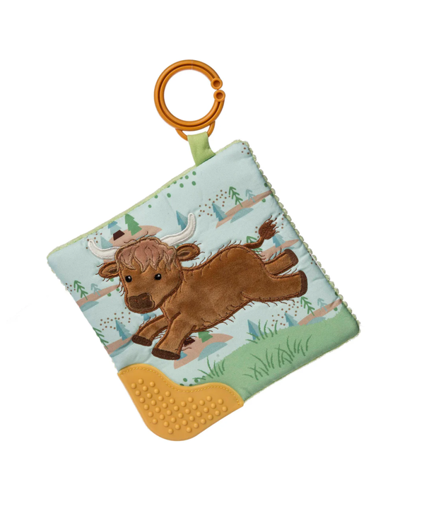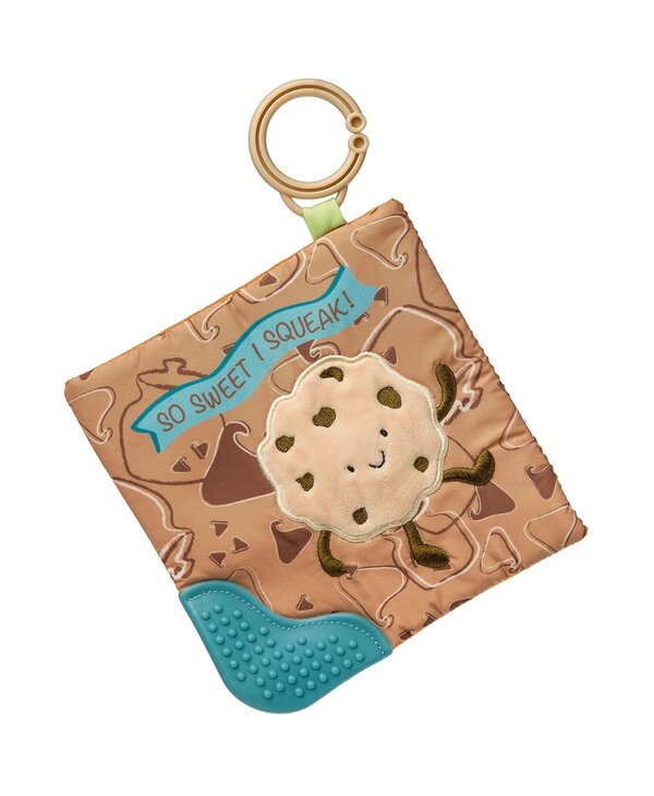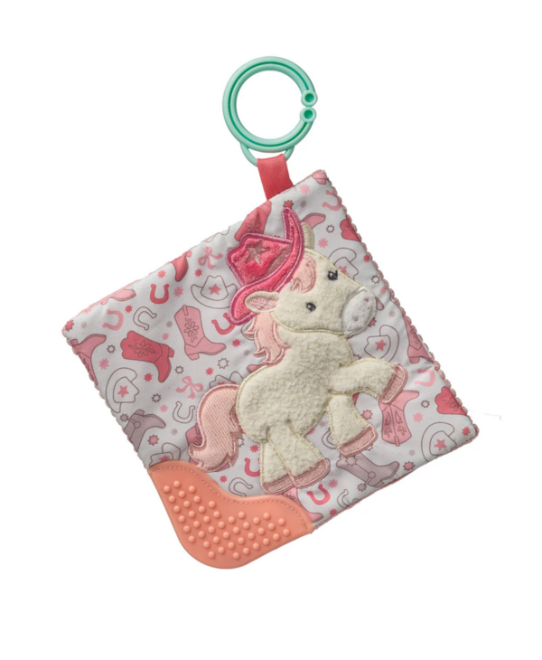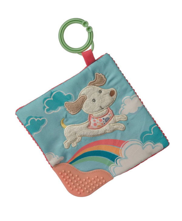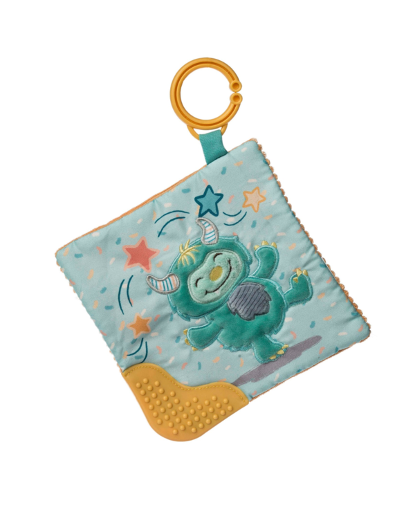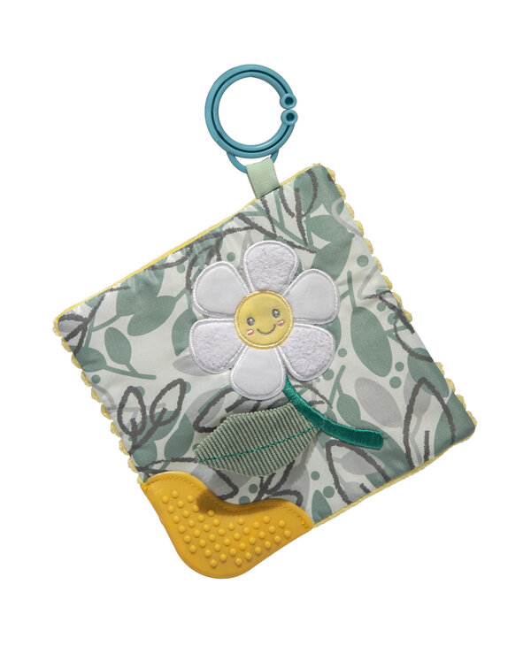 A true standalone item – part soother, part activity toy. Simple activity toy with sewn in teether and floral embroidery. Crinkle sound and squeeze activated squeaker inside. Each Crinkle Teether has fun character appliques and colorful patterns on the outside, crinkle paper and a squeaker on the inside. Baby safe embroidered details.