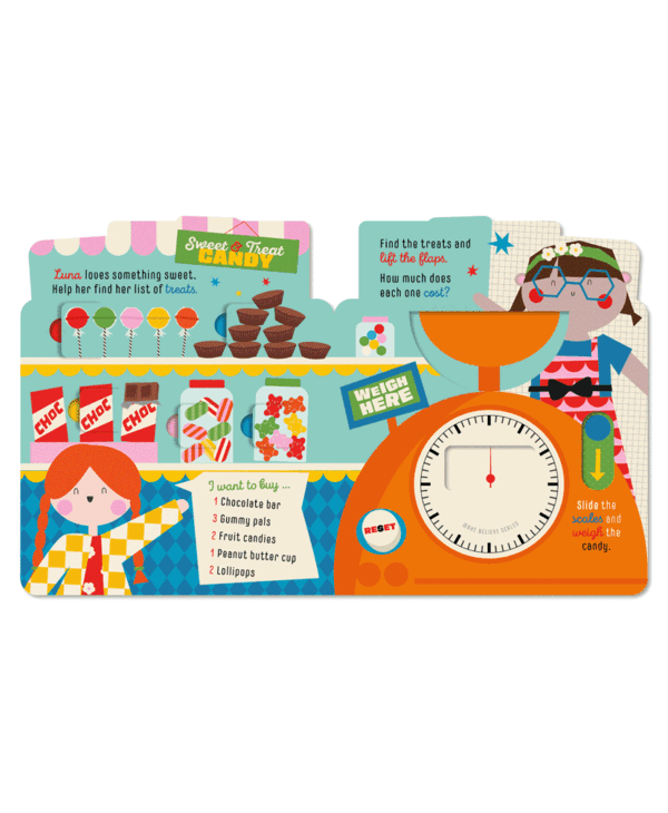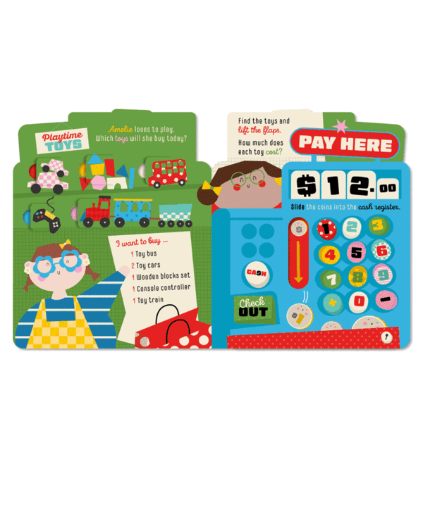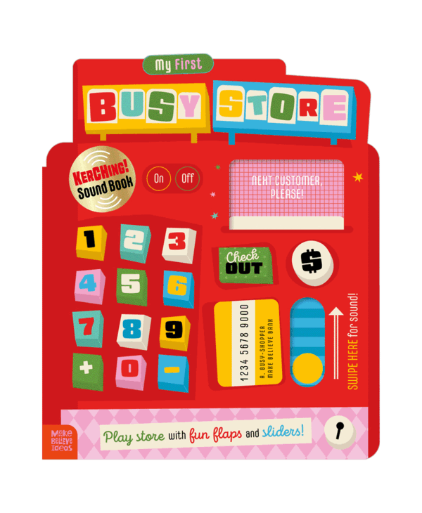 Little ones will love pretending to serve customers as they interact with the flaps and noisy sliders in this cash-register-shaped book.