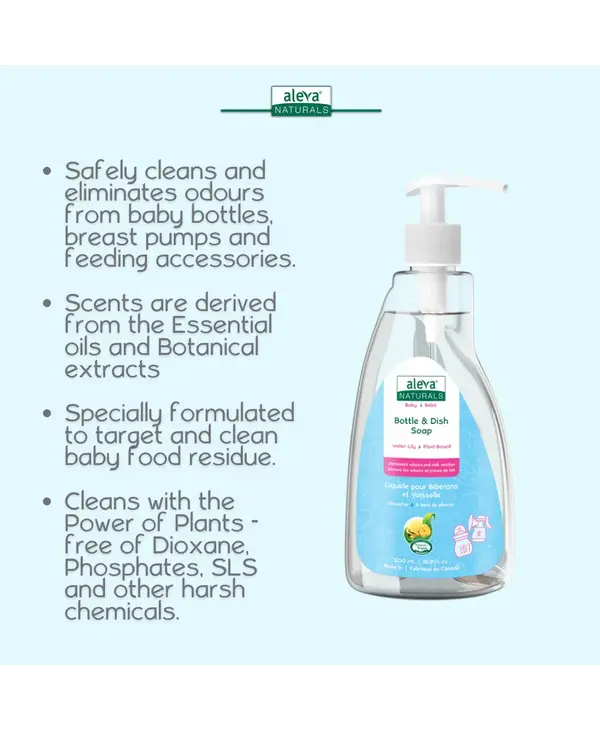 This Bottle & Dish Liquid with a touch of exotic Water Lily scent, is a safe and effective formula for cleaning those baby-specific messes that are often left behind after mealtime. When the sink fills up with food mush on cutlery and dishes, milk film on bottles, cups, and breast-pump, our Bottle & Dish Liquid is the baby-safe solution for a pure and powerful clean. The unique blend of emulsifier and cleansers derived from coconut oil, penetrates grease while organic aloe vera leaves your hand feeling soft. No more worrying about harsh chemicals and toxic residues on baby's feeding accessories.
