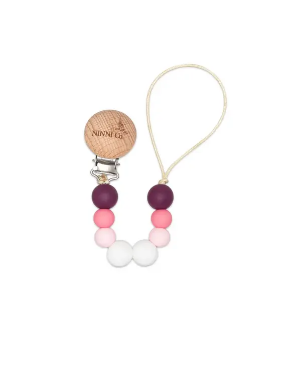 Welcome the latest addition to the Ninni Co. family—the beaded pacifier clip! Designed to perfectly complement your breast-like pacifier, this clip ensures you never lose your little one's pacifier again. Crafted from FDA-approved, BPA-free silicone beads paired with natural wood, this chic pacifier holder in rosebud pink is not only fashionable but also essential for any parent. It's the perfect soothing accessory, regardless of your feeding preference, making every day a little easier and a lot more stylish.