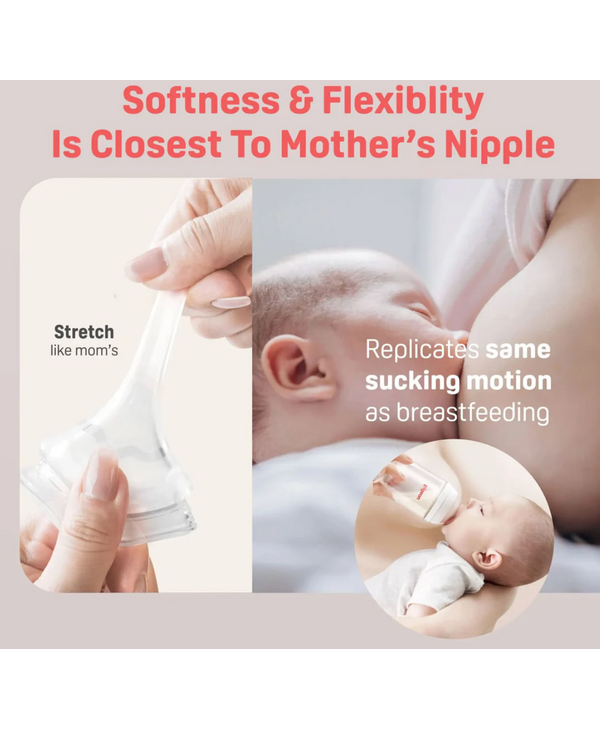 The Breastfeeding Experience bottle and nipple were developed with the goal of smooth use in combination with breastfeeding and allowing babies to drink with the same mouth movements as breastfeeding. It supports a baby's proper latch and smooth tongue movements, making breastfeeding a comfortable experience.