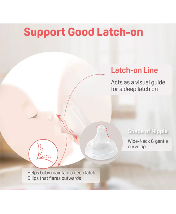 Latch-On: the wavy line on the nipple indicates how deep a baby should latch on. This line serves as a guide for moms and dads who are unsure how deep their baby should latch on. This Latch-On guides babies to a proper latch and supports smooth breastfeeding. Latch-on refers to the moment a mother places her nipple in her baby's mouth just as the baby begins to latch on to the mother's nipple. Once latch-on is successful, your baby and you can start breastfeeding smoothly.