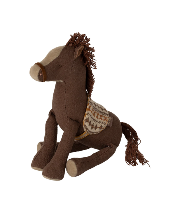 The brown pony is made in a soft cotton/linen fabric. The mane and tail is cotton strings and the saddle is made in soft knitted fabric that guarantees the ride will be comfortable.