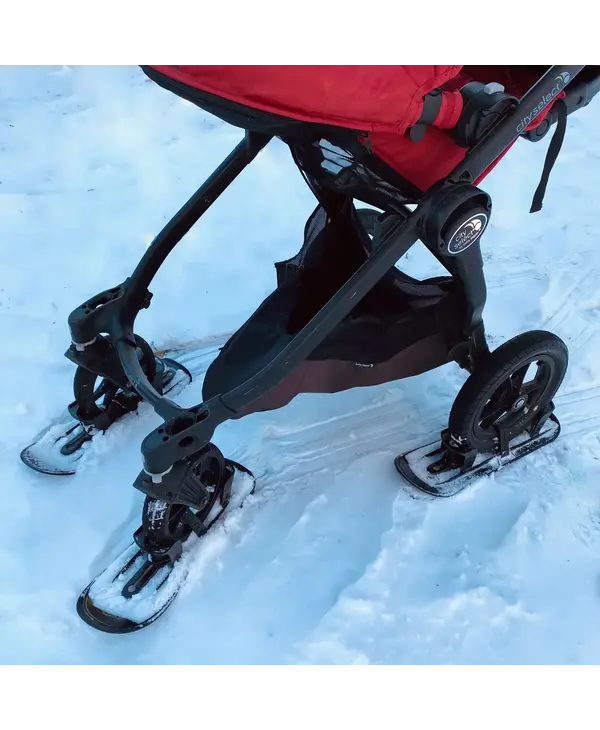 Attach the skis to your stroller and glide through winter. A simple tool-free adjustment allows the skis to attach to just about any stroller wheels available on the market. The skis cut easily through snow and smooth out the ride over uneven terrain. Well-designed and made in Canada, your child is comfortably and securely seated in their own stroller; no worries about your baby falling out of a small sled or getting snow in their face.