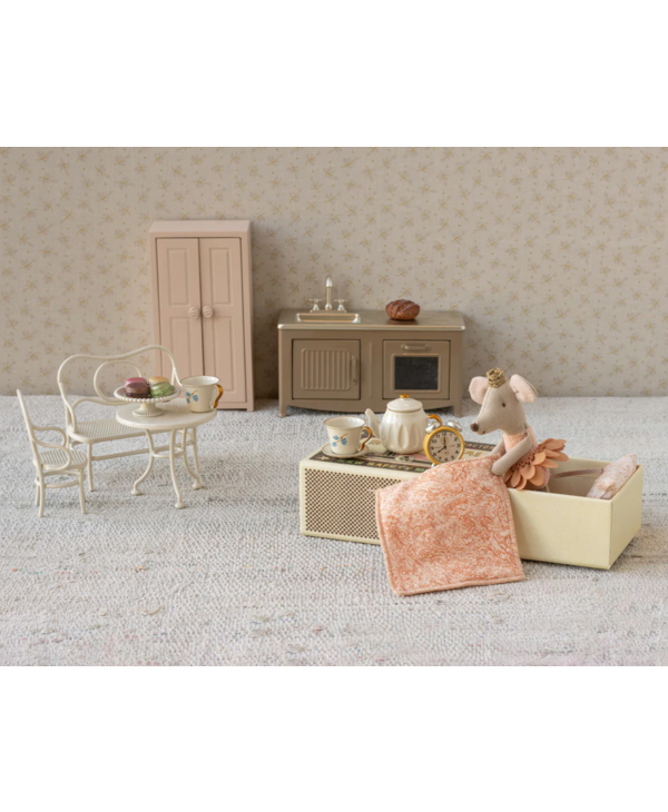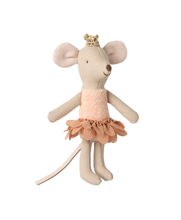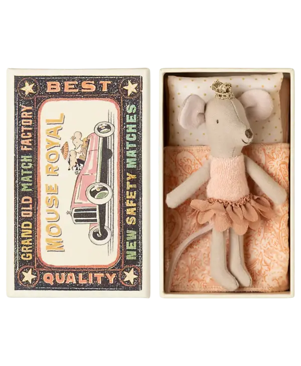 A classic Maileg item. This mouse is ready for hours of play and sleeps tight in a little matchbox. The clothes and bed linen come in unique prints and beautiful colors. Bed linen may vary in color.