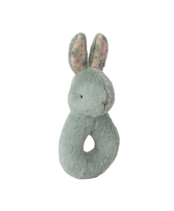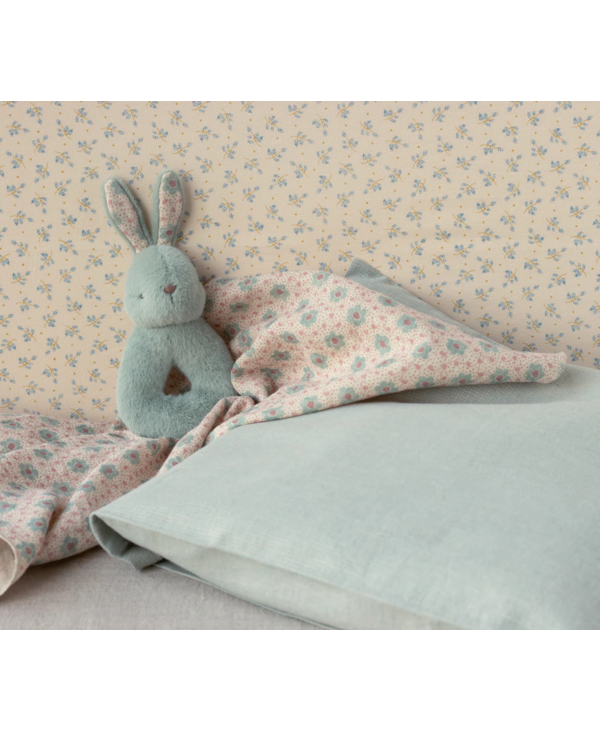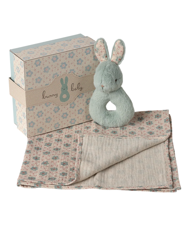 A perfect gift idea for the little ones. The set includes a soft cotton cloth and a small rabbit rattle. The rabbit has a small rattle inside that makes a soft sound. It all comes in a beautiful gift box.