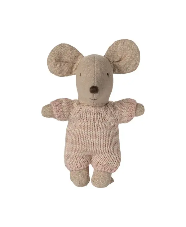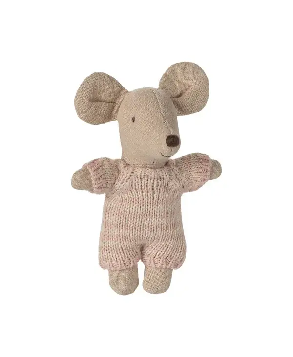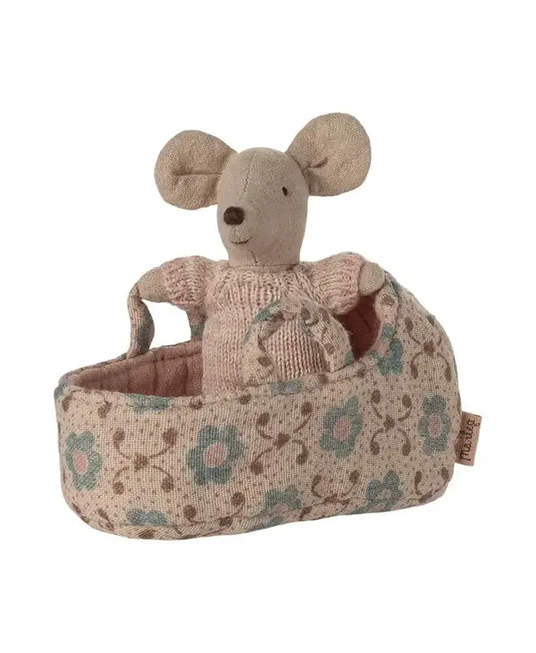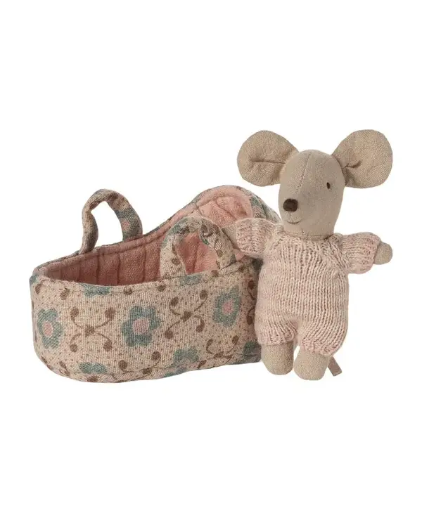 A small baby mouse in a soft and striped knitted suit. It sleeps for hours in its little quilted carry cot.