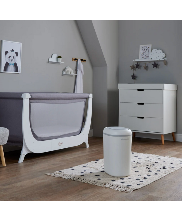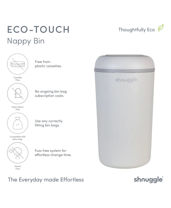 The Shnuggle Eco-Touch Diaper Pail is thoughtfully designed to make diaper changes simpler, more hygienic, and environmentally friendly. With its one-handed 'drop and go' operation, dual-seal odour airlock, and cassette-free system, it ensures that diaper disposal is both convenient and sustainable.