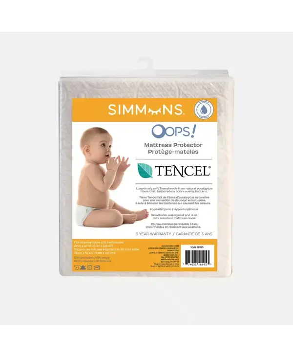 The Simmons Oops Mattress Protector is a perfect compliment to your crib mattress. Made of luxuriously soft Tencel derives from natural eucalyptus fibers that helps reduce odor causing bacteria. This product is hypoallergenic, breathable, waterproof and dust mite resistant. Fits standard crib mattresses.
