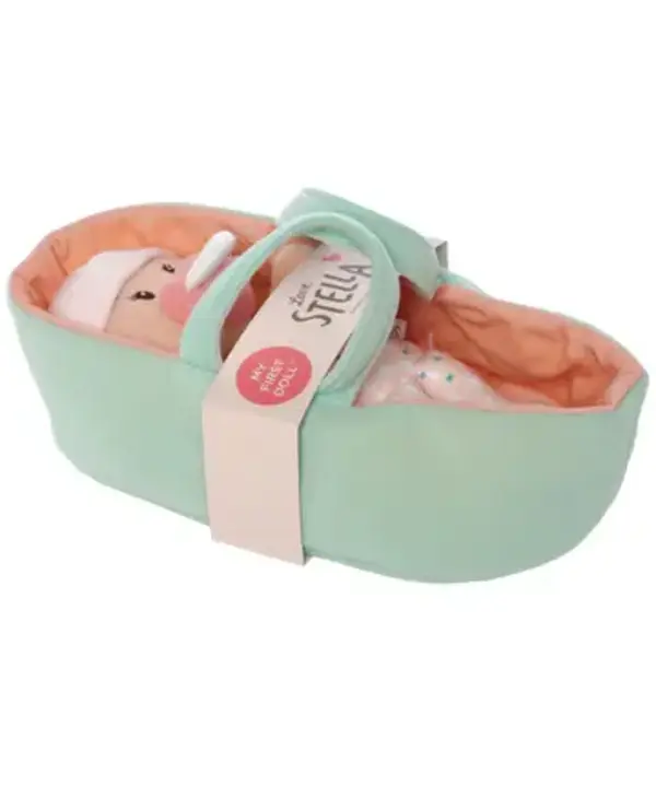 The Love, Stella dolls are the perfect size for holding, hugging, and nurturing role play to foster social and emotional development. My First dolls are 100% soft with a sewn-on onesie, removable hat, and a signature magnetic pacifier design. Their bald heads are slightly weighted with embroidered facial features. Their squishy-soft body has a lightly weighted bottom and sits unassisted. This adorable set comes with a soft bassinet to encourage caring for this delightful baby doll.