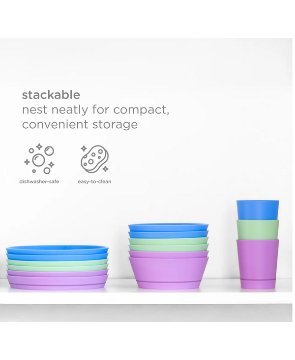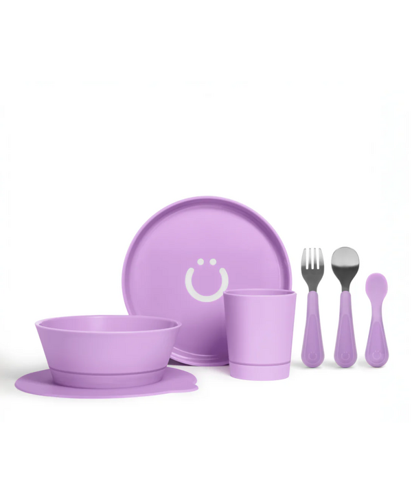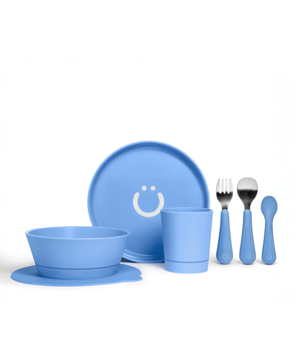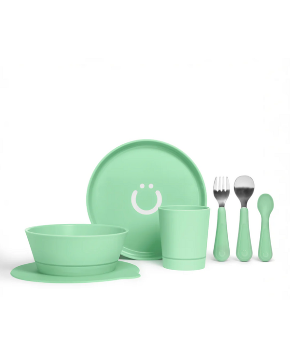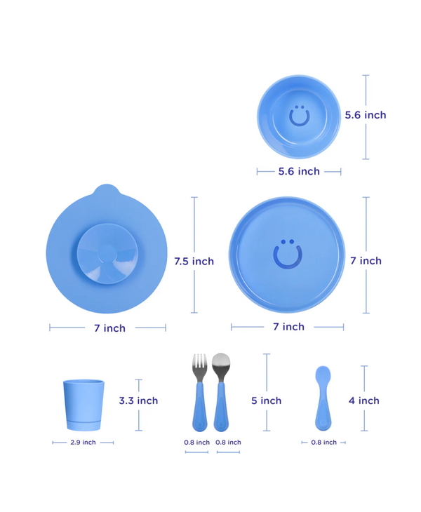 includes 1 plate, 1 bowl, 1 cup, 1 fork, 1 spoon, 1 silicone spoon, and 1 interchangeable suction cup