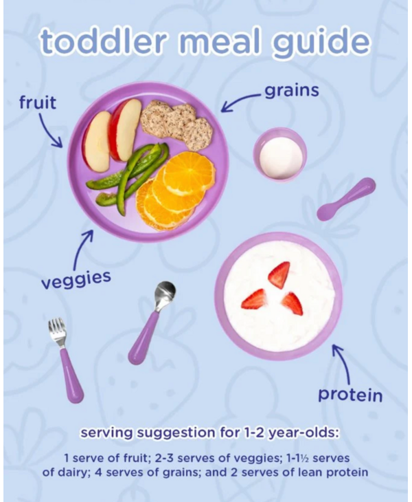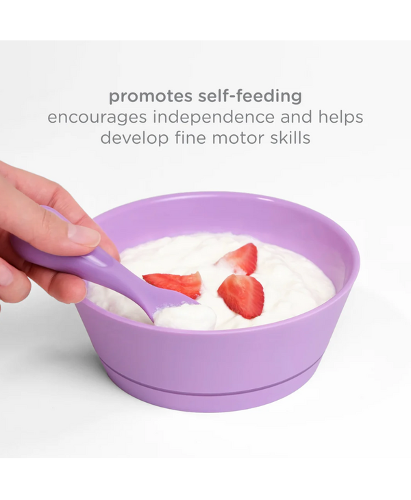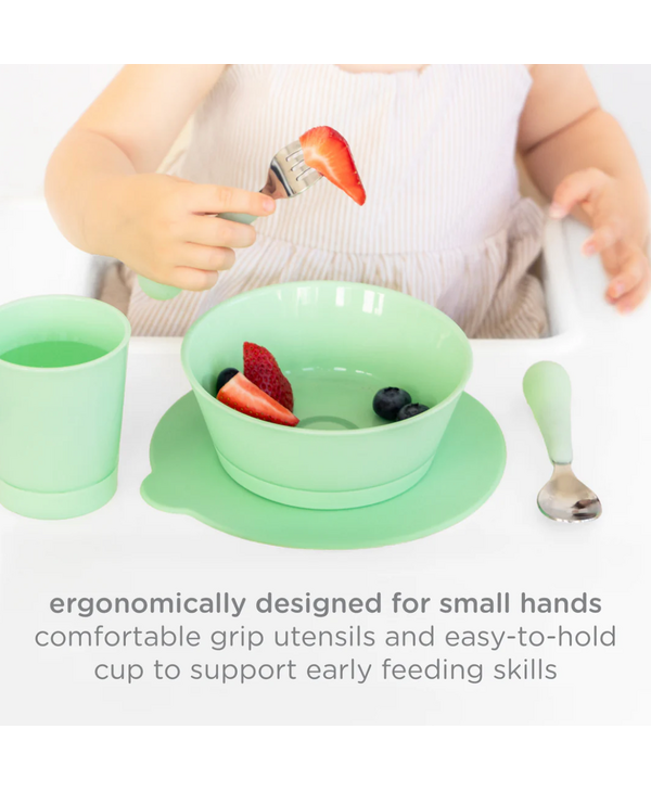 comfortable grip utensils and easy-to-hold cup to support early feeding skills