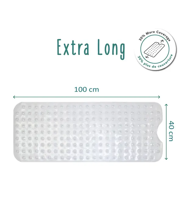 - Extra-long for 30% more coverage than conventional bath mats