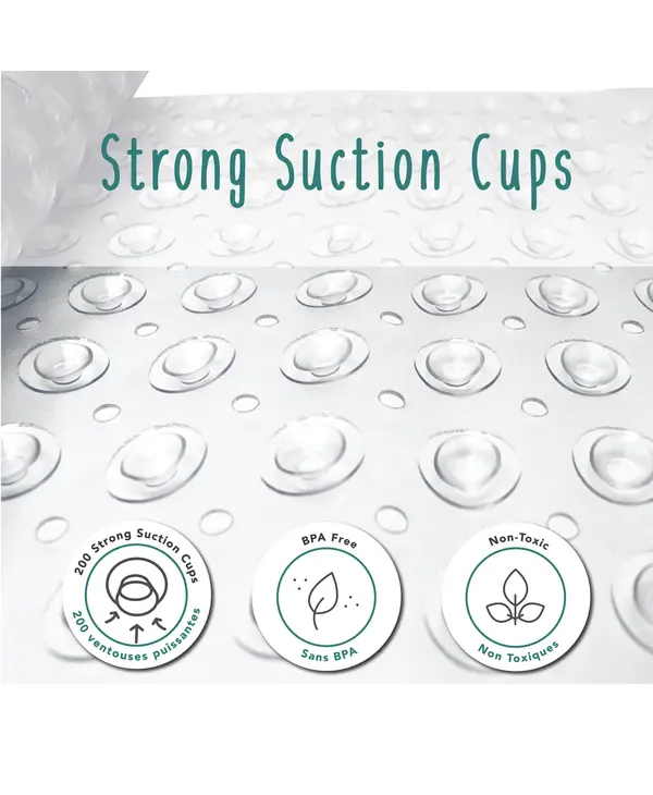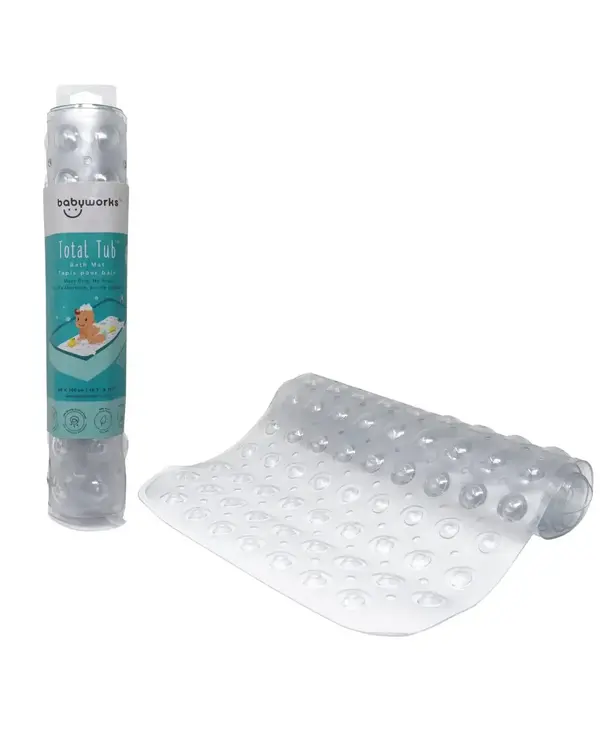 The Baby Works™ Total Tub™ Anti-Slip Bath Mat boasts 200 super-strong suction cups for supreme safety and security while it’s 15.7” x 39.3” (40cm x 100cm) size covers 30% more surface area than conventional bath mats. The bath mat’s surface is textured for comfort and safety for active children who like to move around in the bath. The PVC material is non-toxic, anti-microbial, mold & mildew resistant and free of BPA, Phthalates and Latex. Rinse and hang dry between uses and machine wash as needed! Outfit every bath in the house with the Baby Works Total Tub™ Anti-Slip Bath Mat for ultimate safety in the bath!