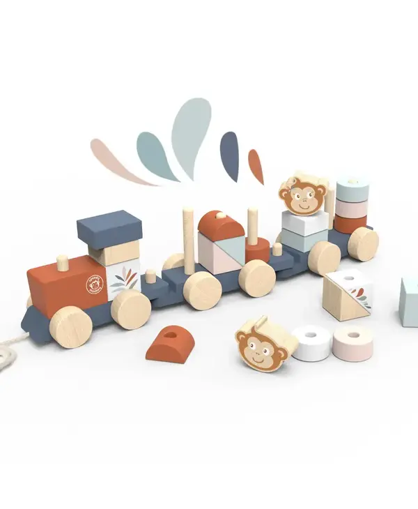 A fun wooden pull-along train stacker, painted in trending soft colours and featuring our favourite character, the monkey.