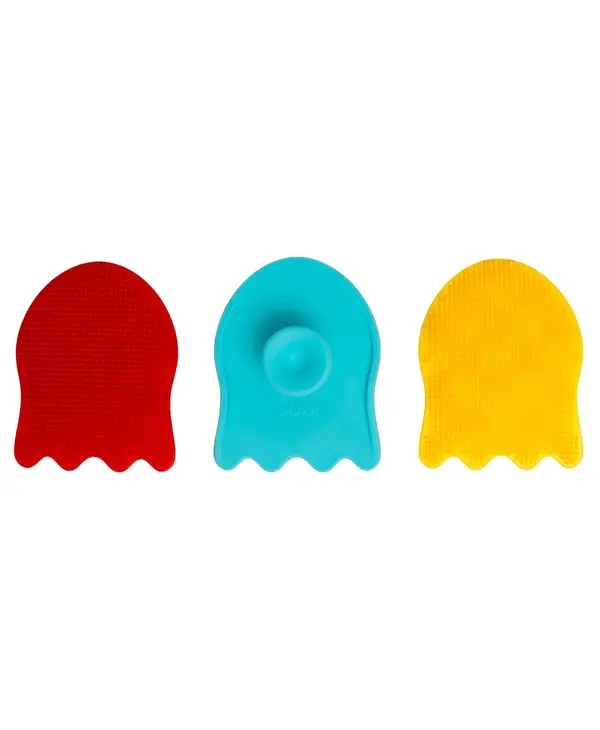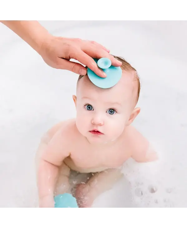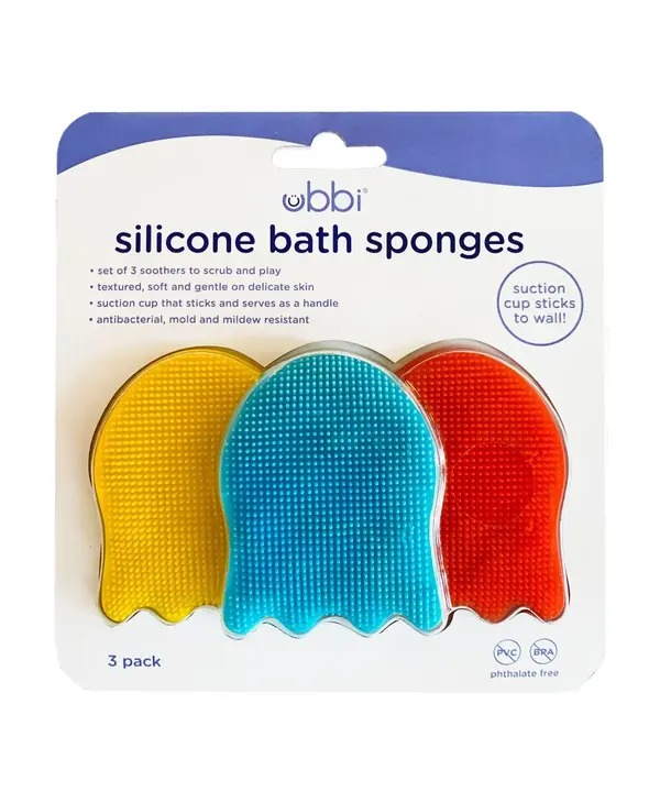 A set of three silicone bath sponges shaped like friendly-looking jelly fish whose suction cups stick to the bath tub as well as serve as handles when scrubbing. Made of 100% silicone, the bath sponges are durable and flexible. To clean the sponges, simply place on the top rack of the dishwasher and air dry before storing to prevent mold growth. Made to scrub and massage, but these jolly and colorful creatures can also be used for creative play in the bath tub! Made for newborns to be soft and gentle on their delicate skin and cradle cap, but the silicone bath sponges can be used by everyone in the family!
