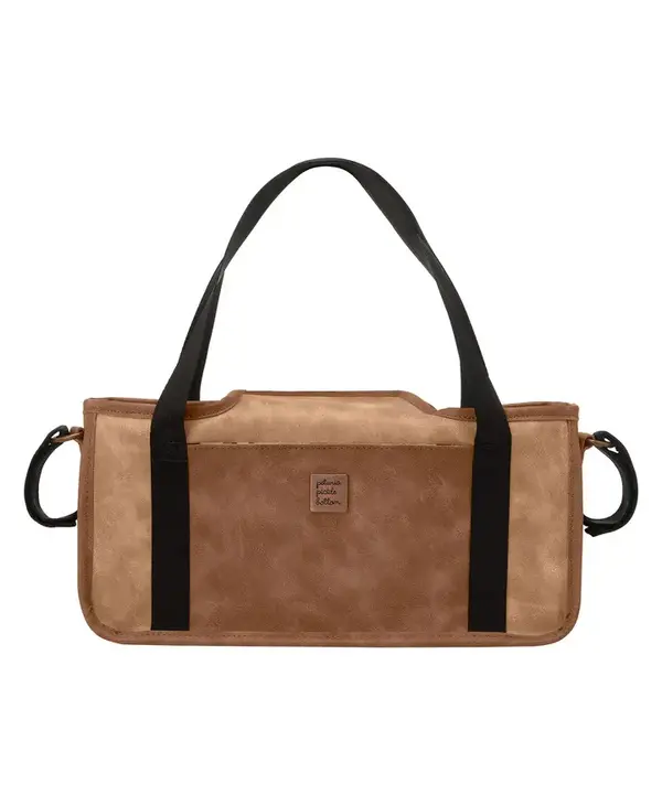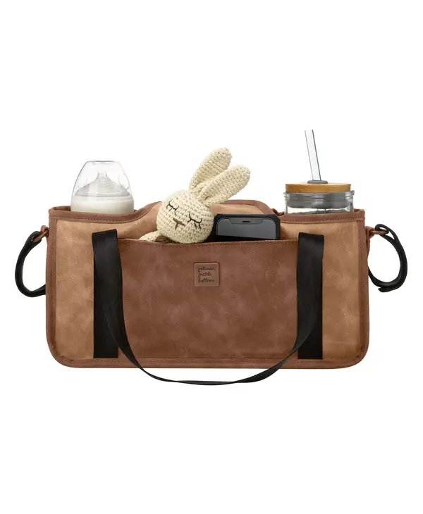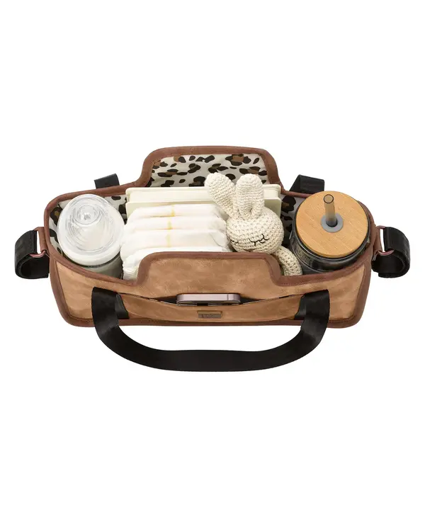 The perfect on-the-go companion, the Wander Stroller Caddy doesn’t miss a step. Smartly designed compartments, insulated cup holders, and a hidden fold-out pocket keep your essentials neatly organized and at-the-ready. Wear it over the shoulder when the stroller is parked or left behind. Featured in Brioche, a vegan leather ultra-soft, faux nubuck textile with a weathered look for effortless style. Naturally water resistant and easy to clean and care for. Paired with complementing metal hardware and genuine leather zipper pulls.