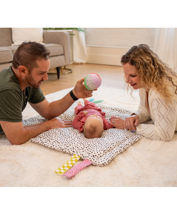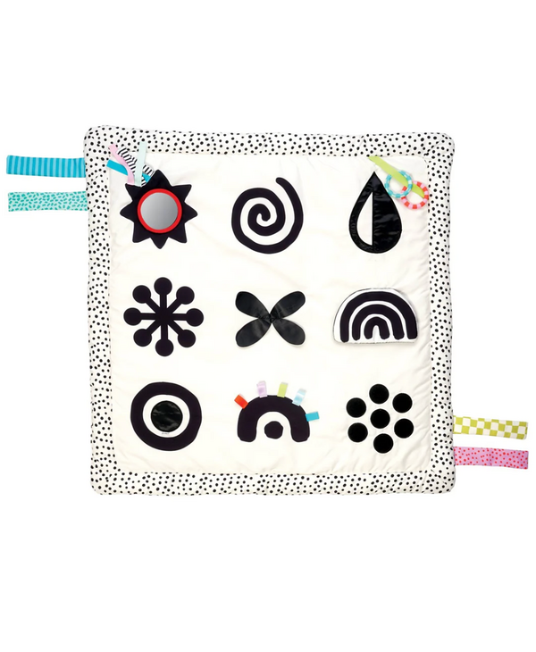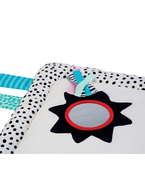 The simple organic polka-dot pattern is a subtle introduction to black-and-white high-contrast visuals to support baby’s natural visual progression. The reverse side features nine high-contrast graphics, various fabric textures, a removable discovery mirror, two teethers, colorful textured ribbons, a crinkle flap and colorful crinkle strips along two of the mat corners.