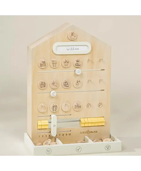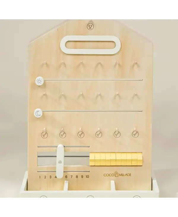 With 44 wooden chips divided into four categories - Morning Routine, Evening Routine, Tasks, and Rewards - each day is clearly organized. Children follow their daily schedule, earn stars by completing tasks, and then exchange stars for a weekly reward.
